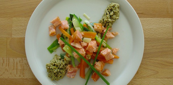 Groente ‘spaghetti’ met gerookte zalmsteak