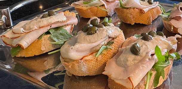 Bestrijk de broodjes met de saus en leg er wat rucola op. Leg hier een half plakje fricandeau op en versier met een paar kappertjes en versgemalen peper.